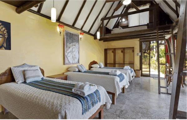 There are 3 single beds on the lower level, and 2 loft areas with a single bed in each loft. There are 2 bathrooms each with a toilet and a sink, and 2 open air showers with curtains for added privacy. Many of our guests have told us they LOVE the open air showers so they can look out over the jungle and the ocean… something they definitely can’t experience from home.